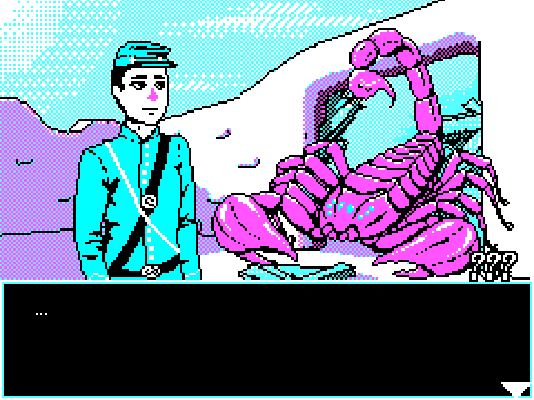 "You're an Union soldier on your way to Fort Bowie, in the Apache Pass, but you never imagined you'd find love in such a place. Specially, not in a gentle, ten-foot-long scorpion. " - Author's description