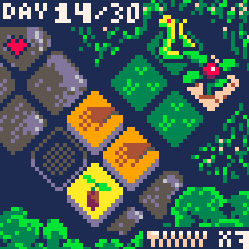 "Arrange a random set of blocks to get the most out of your garden in 30 days and rack up a high score. Till, plant, water, harvest…but keep an eye out for snakes!" - Author's description