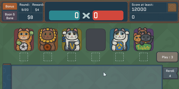 "Cats & Dice is a dice-building roguelike all about getting the right synergies to pull off crazy combos and attain as high a score as you possibly can." - Author's description